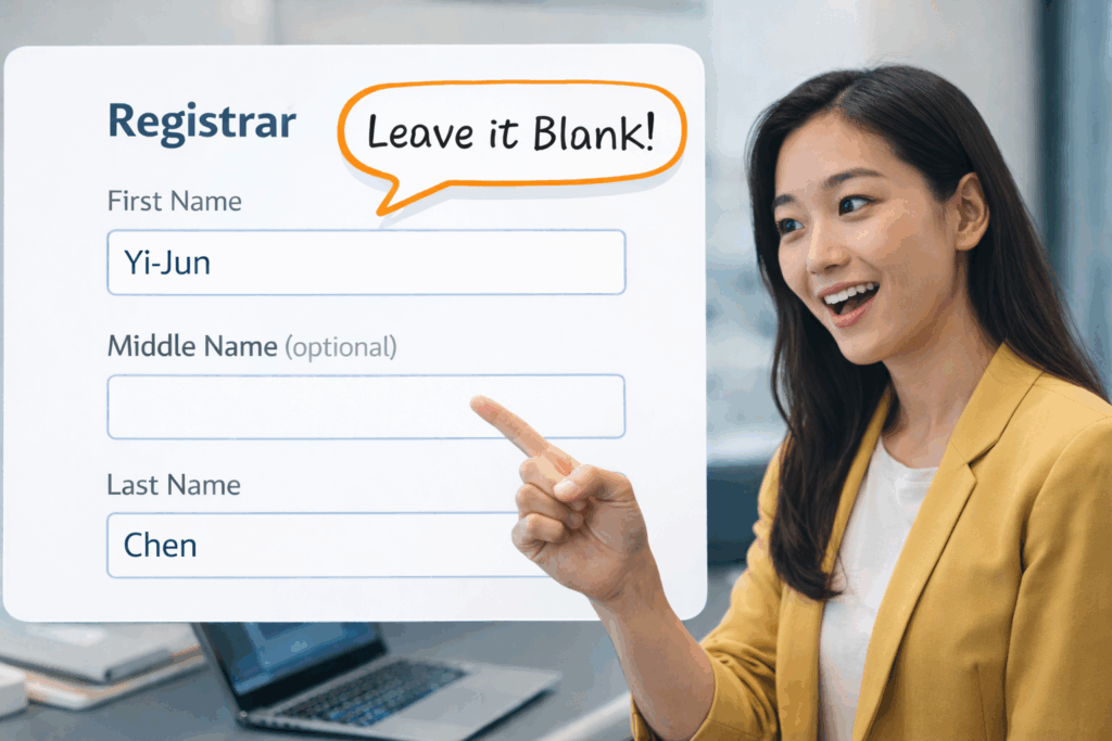 也因為順序剛好相反,許多人接觸英文姓名時會下意識用中文習慣理解,導致填寫混淆。此外,部分英文姓名還會包含 Middle Name(中間名),結構比中文姓名多了一個層次。